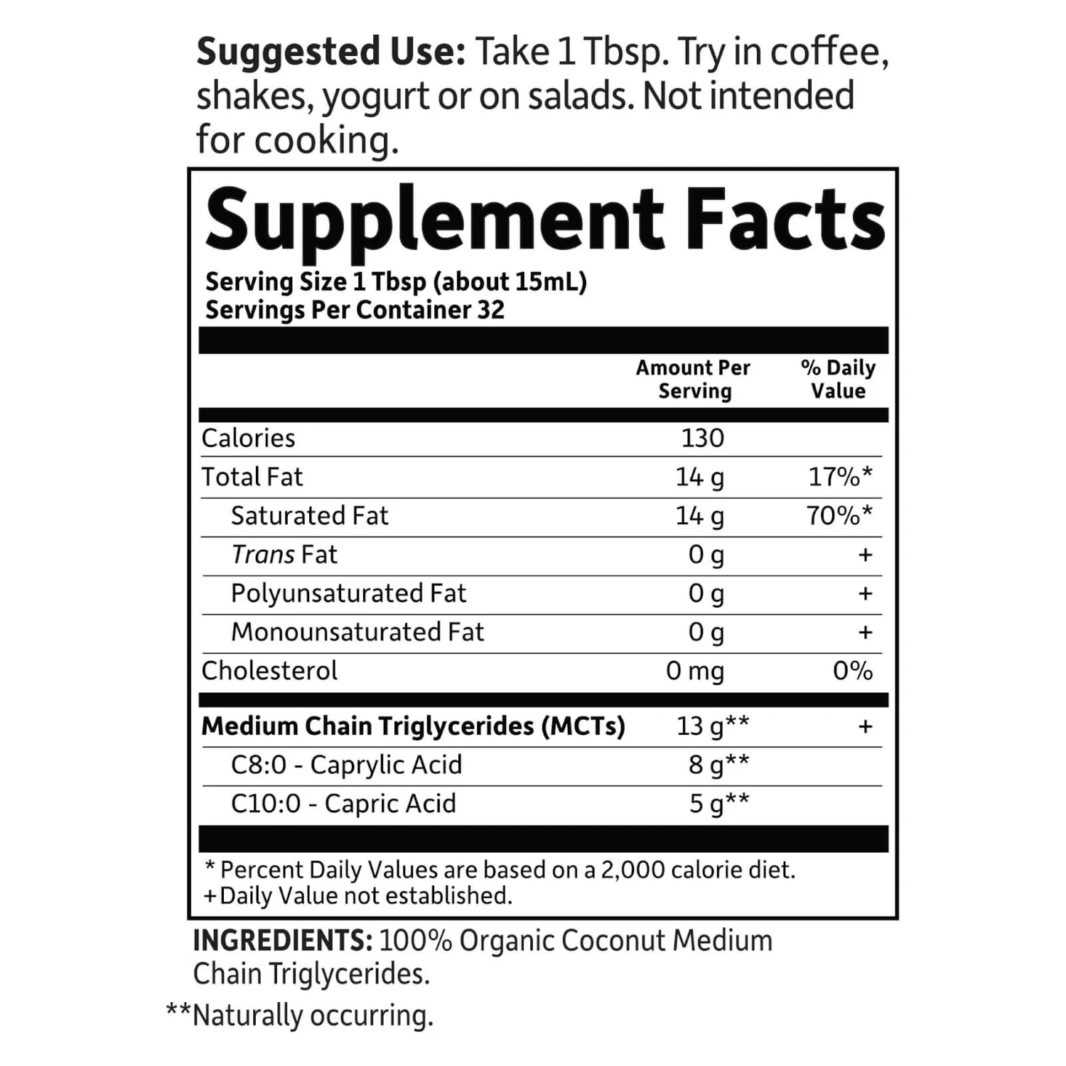 Our Organic Coconut MCT Oil formula contains 13g of MCTs, including caprylic and capric acids, per serving.