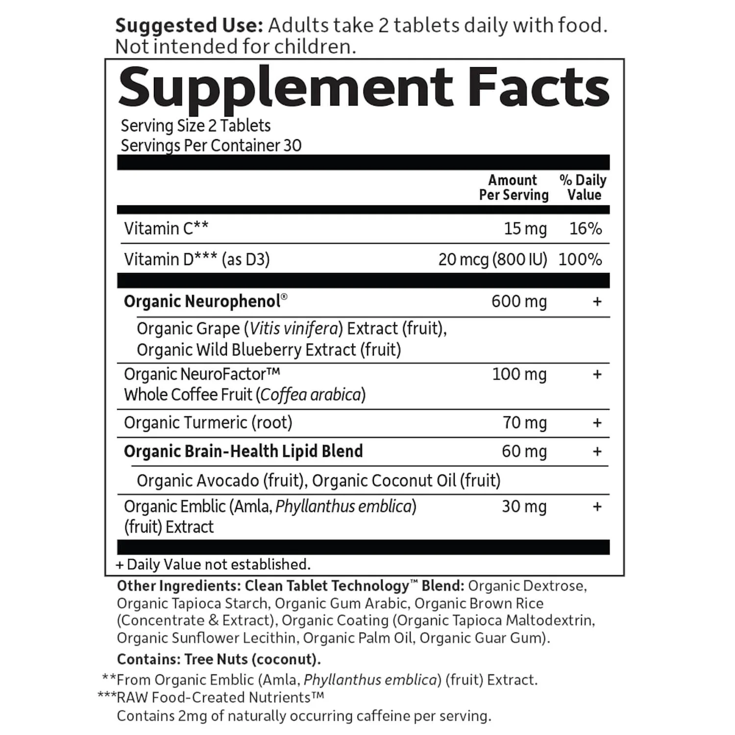 - Each capsule contains 600mg of Organic Neurophenolâ„¢ (from organic grape and wild blueberry), and 100mg of Organic NeuroFactorâ„¢ (from organic whole coffee fruit)
