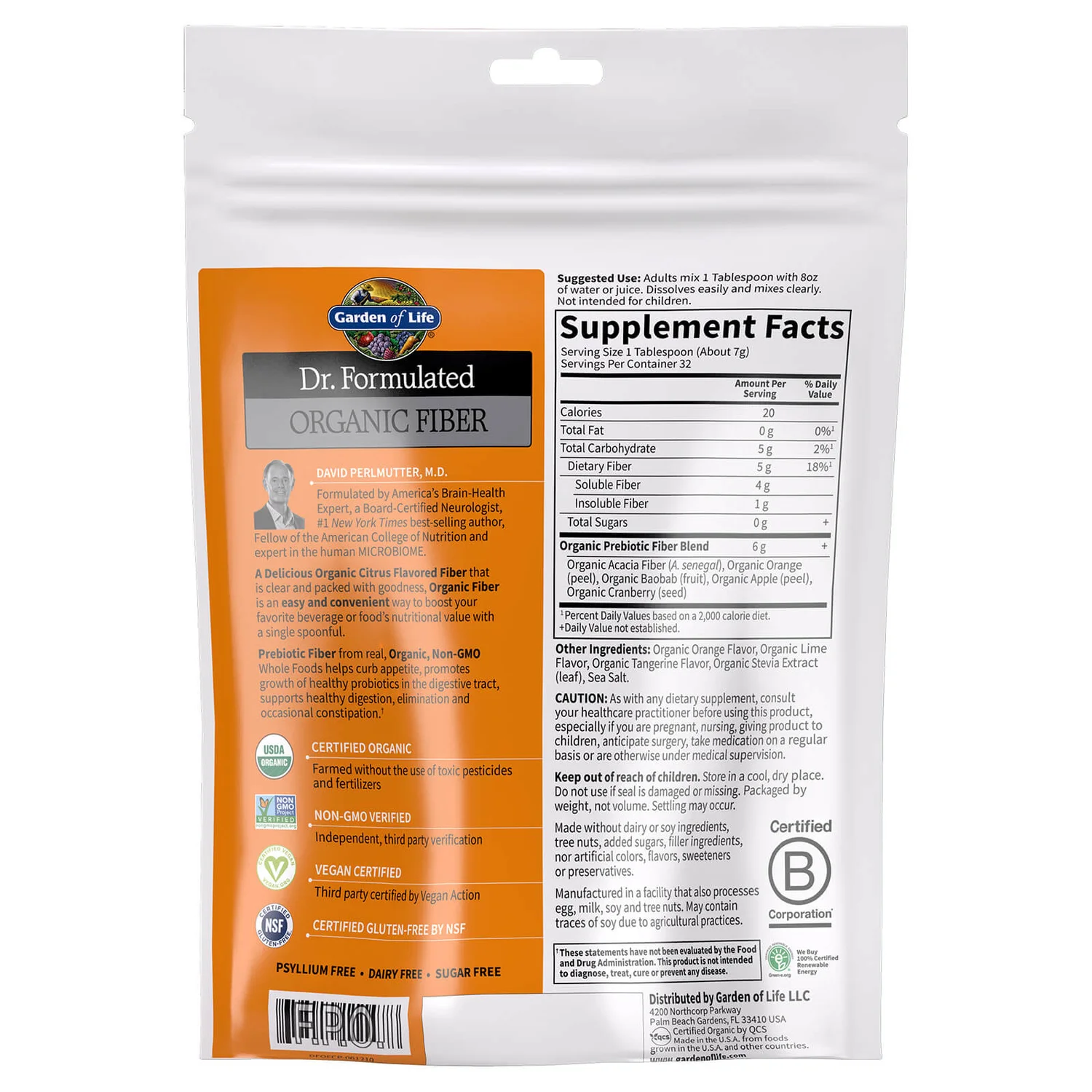 Garden of Life Organic Fibre provides a source of prebiotic fibre from five nutritious organic superfoods: acacia, orange peel, baobab fruit, apple peel and cranberry fruit.