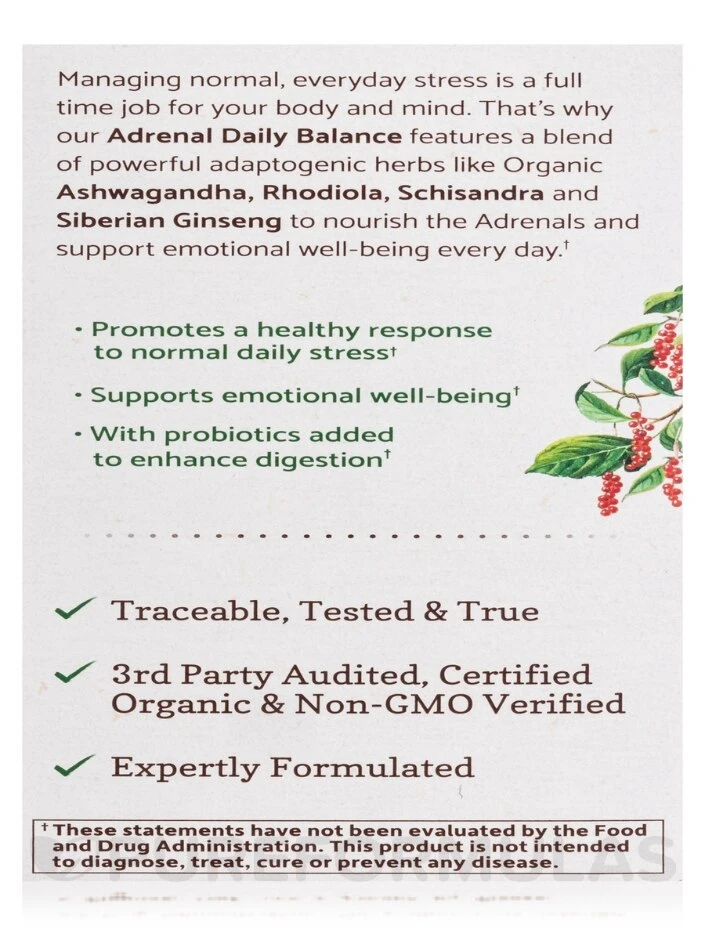 Dealing with daily stress can be overwhelming for both your body and mind. Thankfully, Adrenal Daily Balance provides a natural solution with its unique blend of strong adaptogenic herbs such as Ashwagandha, Rhodiola, and Schisandra, all certified USDA Organic and Non-GMO Project Verified. By nourishing your adrenals and promoting emotional well-being, Adrenal Daily Balance helps you tackle stress head on, every day.