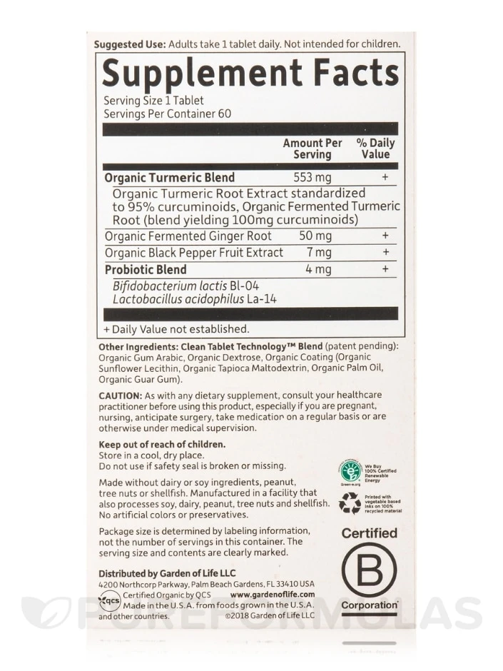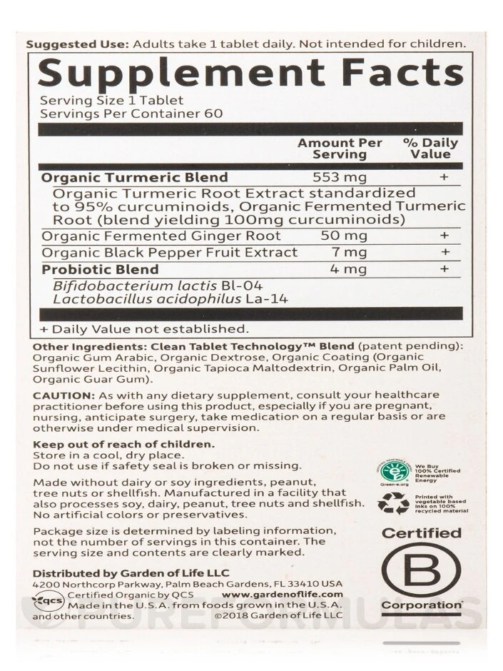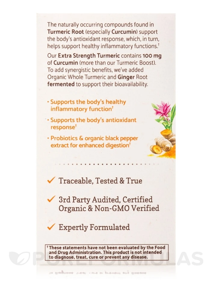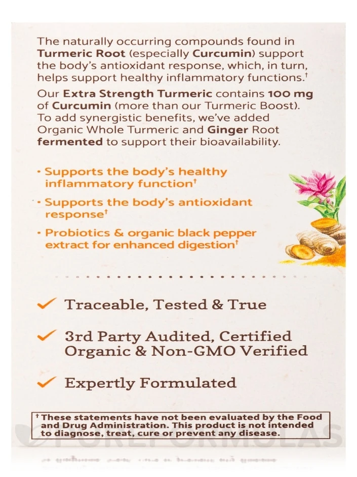 The naturally occurring compounds in Turmeric Root, specifically curcumin, aid the body’s antioxidant response and promote healthy inflammatory function. Garden of Life’s Extra Strength turmeric includes 100mg of curcumin, and further enhances bioavailability through the addition of fermented organic whole turmeric and ginger root.