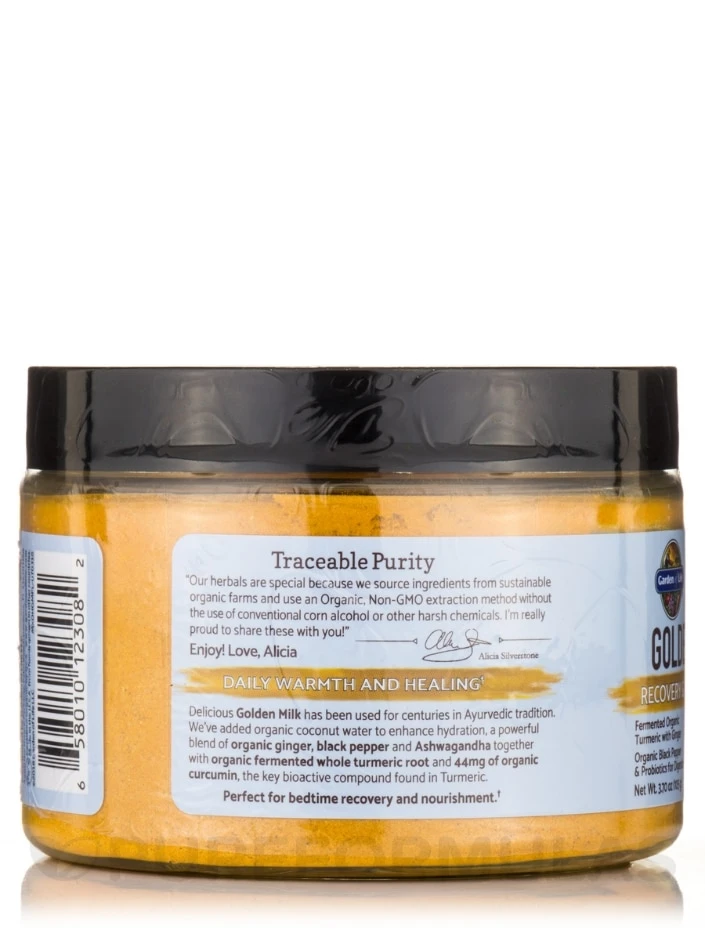 Enhance your bedtime recovery and nourishment with delicious Golden Milk, a centuries-old Ayurvedic tradition. Garden of Life has combined organic coconut water for hydration, a potent mix of ginger, black pepper, and Ashwagandha, with fermented whole turmeric root that contains 44mg of curcumin, the primary active compound in turmeric. Try it now!