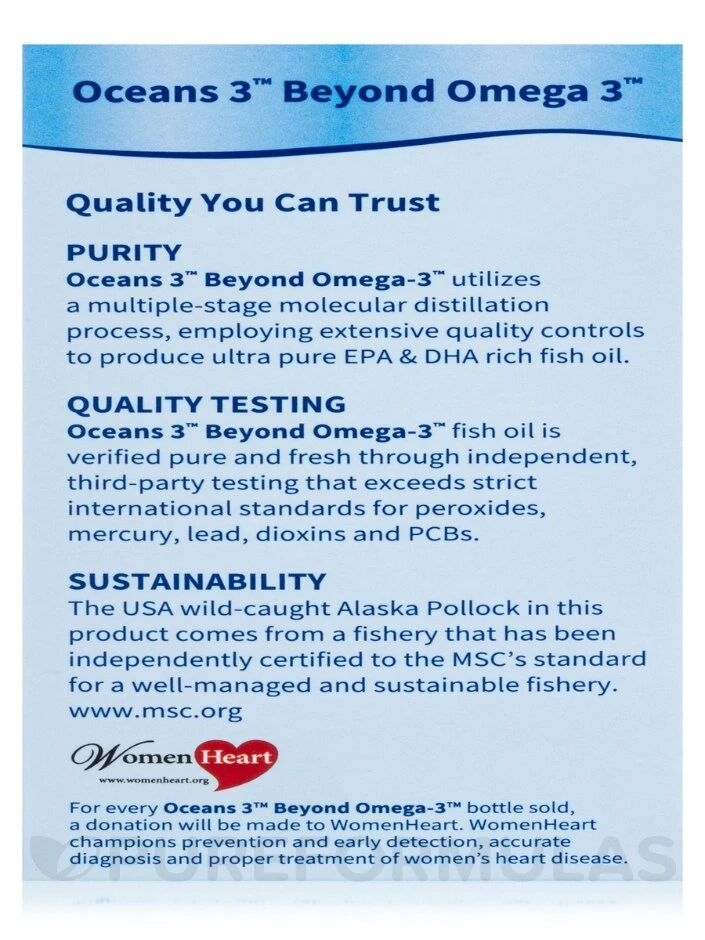 Discover the Benefits of Omega-3 Fish Oils with Oceans 3. This ultra-pure, high potency formula is rich in EPA and DHA, nutrients that support cardiovascular, brain, and nervous system health. The fish oils are purified using a multiple-stage molecular distillation process to ensure maximum concentration and remove harmful toxins. Trust in the power of nature to support your health with Oceans 3 Omega-3 fish oils.