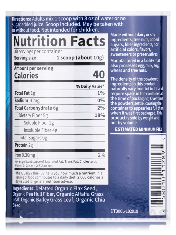 This product contains 100% certified organically grown flax seed and pea hull fiber, alfalfa and barley grasses, and chia seed – all providing an excellent source of dietary fiber. With 5 grams and 20% of the Daily Value, this product helps entrap toxins like metals, lead, mercury, and other environmental pollutants within the gastrointestinal tract for removal from the body. This unique patent pending combination of organic fibers is resistant to breakdown and fermentation by intestinal flora, which means it won’t recirculate toxins into the body. Plus, this product is gluten-free and contains no psyllium or harsh laxatives.