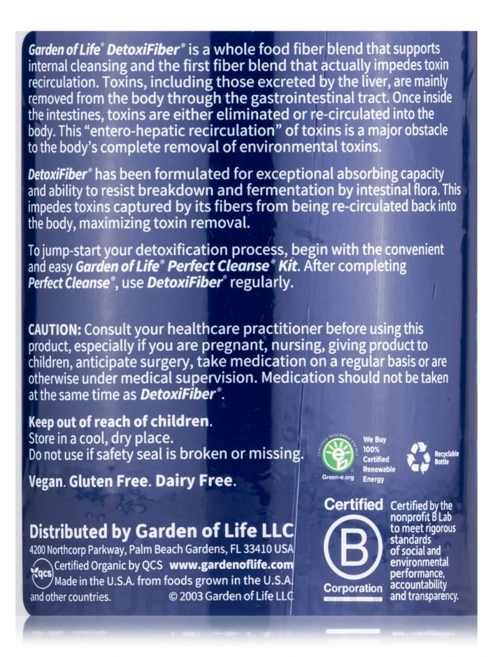 Support your body’s natural cleansing process with DetoxiFiber from Garden of Life. This daily supplement is packed with a blend of soluble and insoluble fiber derived from whole foods, giving you the necessary nutrients for a healthy gut. Get the fiber your body needs to feel its best with DetoxiFiber.