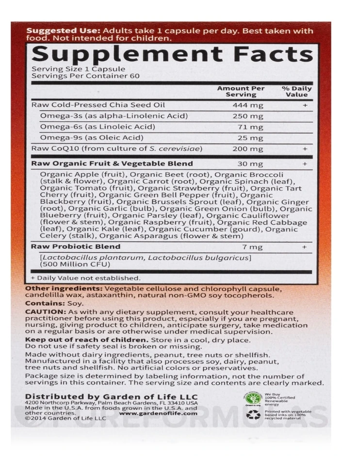 Introducing RAW CoQ10™ by Garden of Life – a potent formula that provides 200mg of RAW CoQ10 per serving. This fat-soluble coenzyme is renowned for its role in producing cellular ATP, acting as an antioxidant, and transporting electrons in the respiratory chain. RAW CoQ10™ features a unique delivery system with cold-pressed chia seed oil and a matrix of omega 3-6-9. This matrix, combined with 22 RAW and organic fruits and vegetables, promotes cardiovascular system health, antioxidant protection, and cellular energy production.