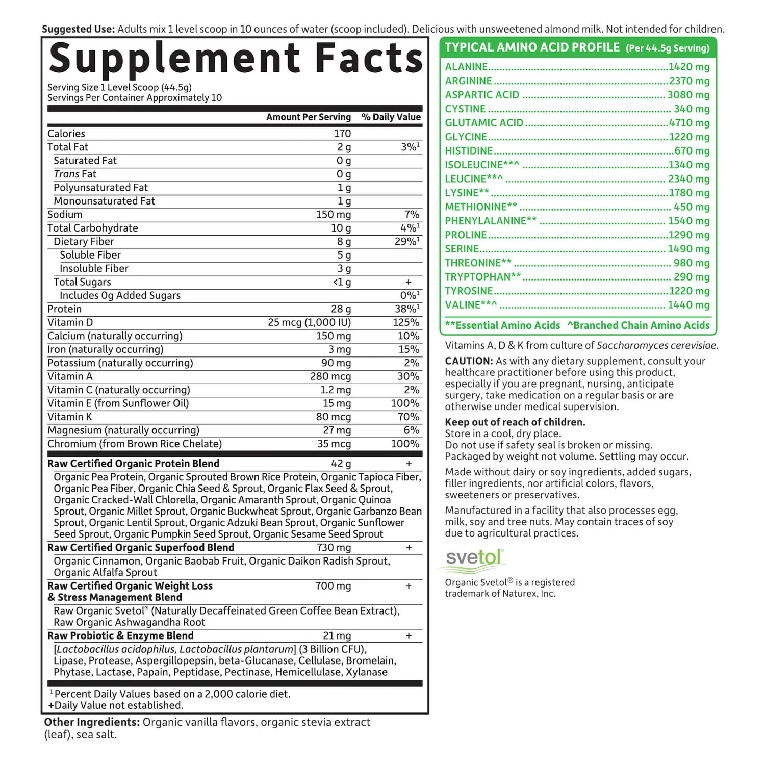 Raw Organic Fit differs from our other proteins because it has several additional clinically studied ingredients, including Svetol® Green Coffee Bean Extract, Raw Food Created Chromium and Organic Cinnamon to help you burn fat[2], and maintain healthy blood sugar[3]. Our Certified Organic plant proteins in Raw Organic Fit are produced at low temperatures, preserving their complete amino acid integrity.