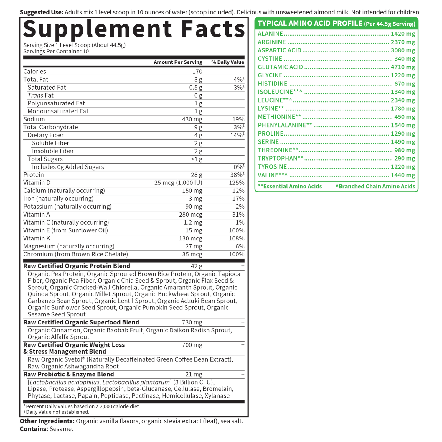 Raw Organic Fit differs from our other proteins because it has several additional clinically studied ingredients, including Svetol® Green Coffee Bean Extract, Raw Food Created Chromium and Organic Cinnamon to help you burn fat[2], and maintain healthy blood sugar[3]. Our Certified Organic plant proteins in Raw Organic Fit are produced at low temperatures, preserving their complete amino acid integrity.