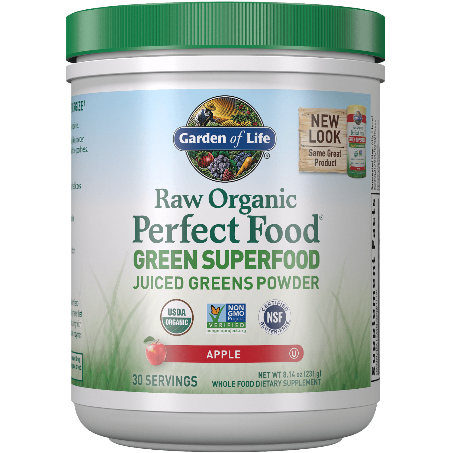 Raw Organic Perfect Food Green Superfood Apple 231g Powder Packed with 40 nutrient-dense, RAW and organically grown greens, Raw Organic Perfect Food Green Powder is certified USDA organic and non-GMO Project verified. Our Raw Organic Perfect Food grasses are juiced at the farm, straight after picking, using cold temperatures to dry them. This all takes place within an hour of harvesting.