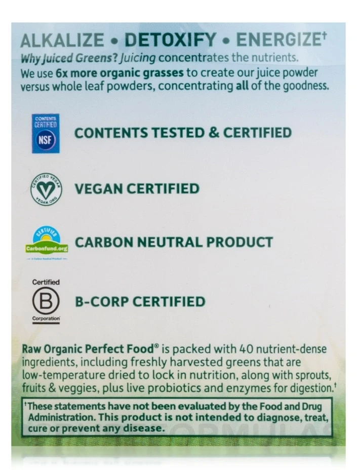 Looking for a powerful, nutrient-packed superfood that’s vegan and organic? Meet Raw Organic Perfect Food. This unique blend of 34 green, sprouted, and juiced ingredients provides the raw energy you need to tackle your day. And with dual certification from both the USDA and Non-GMO Project, you know you’re getting the best. Plus, thanks to this farm-to-table process, every dose is brimming with locked-in nutrition. Try Raw Organic Perfect Food and feel the difference today.