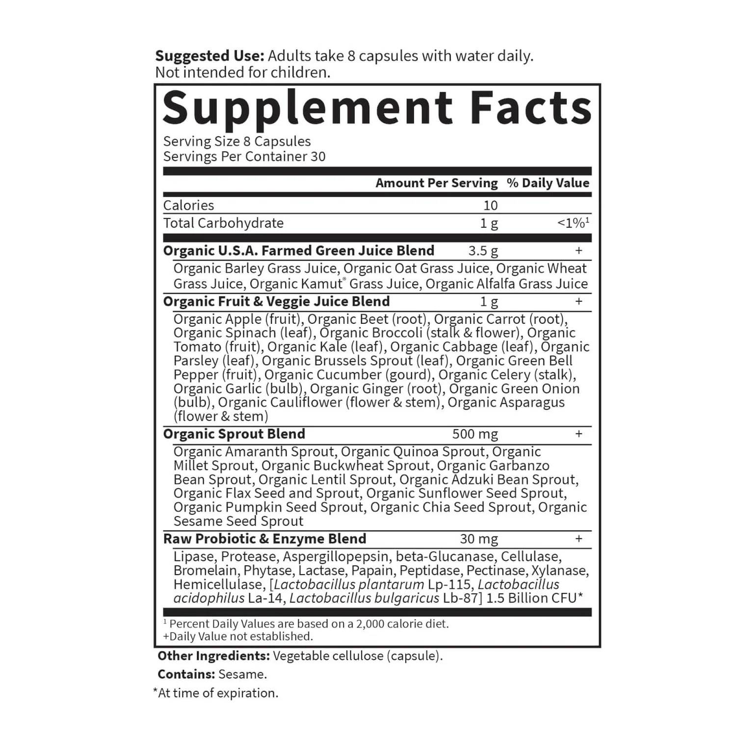 All greens are Certified Organic and grown sustainably. They’re harvested before the grain buds, which prevents any gluten from forming, and are juiced immediately after at the farm. All this organic goodness is transferred into convenient capsules that are easy to take.