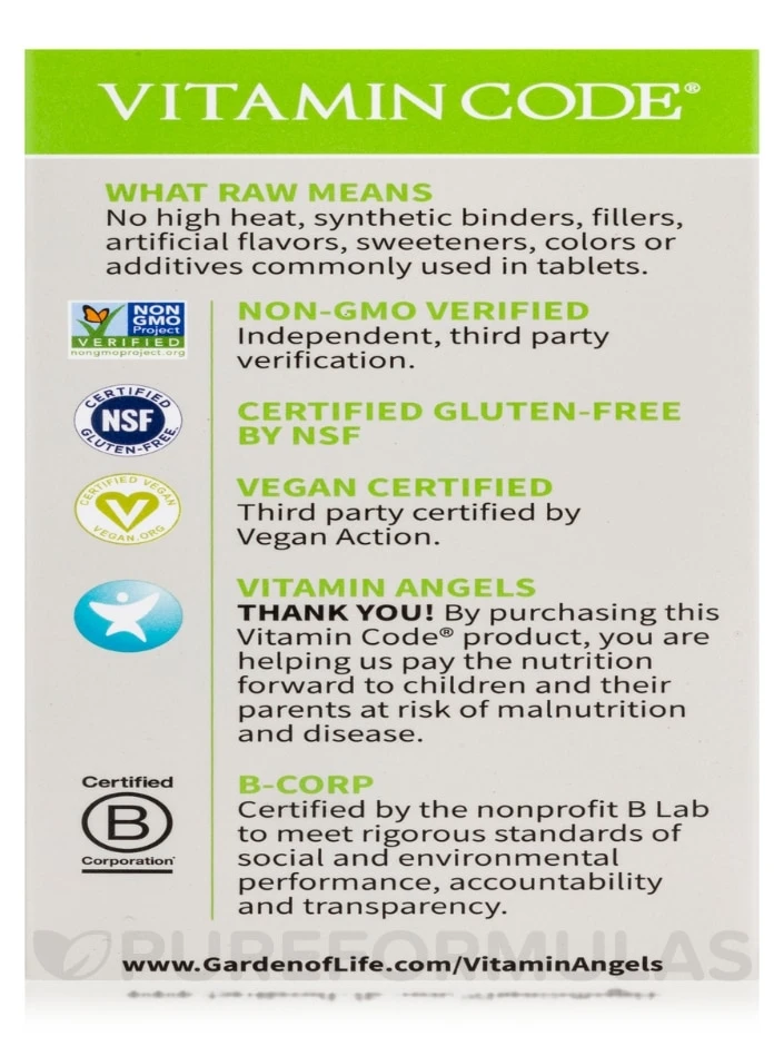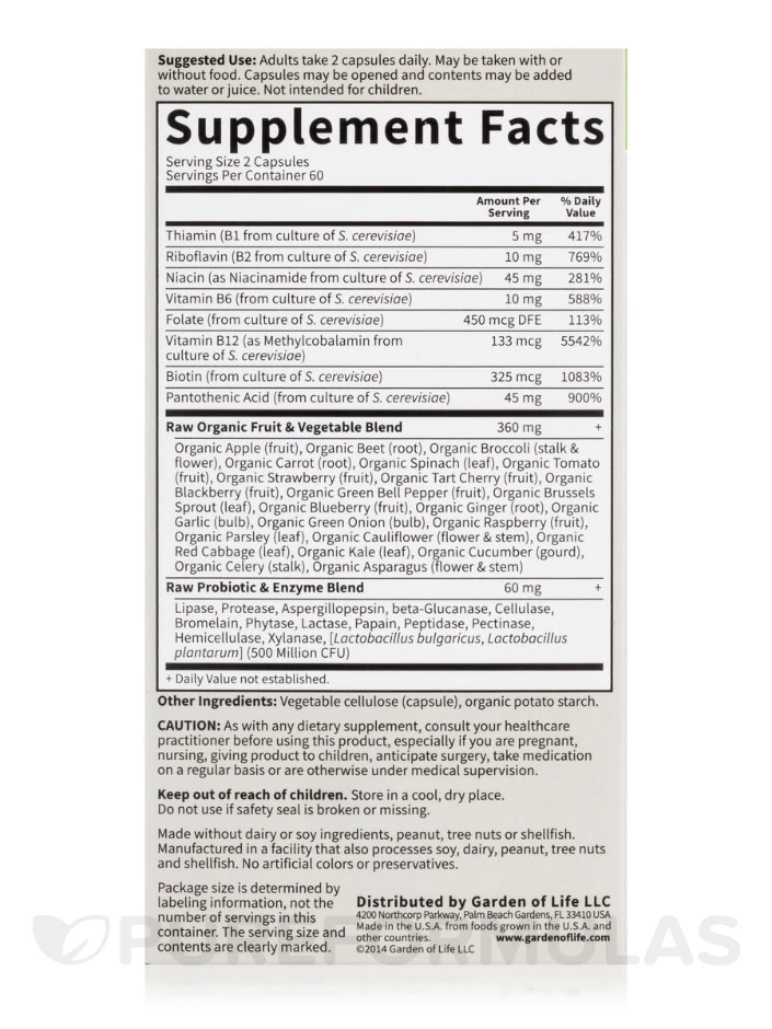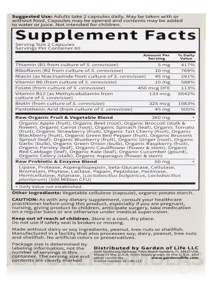 Discover the power of Garden of Life®’s RAW B-Complex, the ultimate multi-nutrient formula made with RAW Food-Created Nutrients™. Say goodbye to synthetic vitamins and hello to a comprehensive blend of whole-food ingredients delivering vitamins B1, B2, B3, B5, B6, B12, folate, and Biotin. Thanks to this unique Code Factors™, you can trust that your body will receive natural recognition of nutrients, just as nature intended. These synergistic compounds work together to infuse the essential elements of whole-foods, making sure your body thrives upon it. Try RAW B-Complex today and see the difference for yourself.