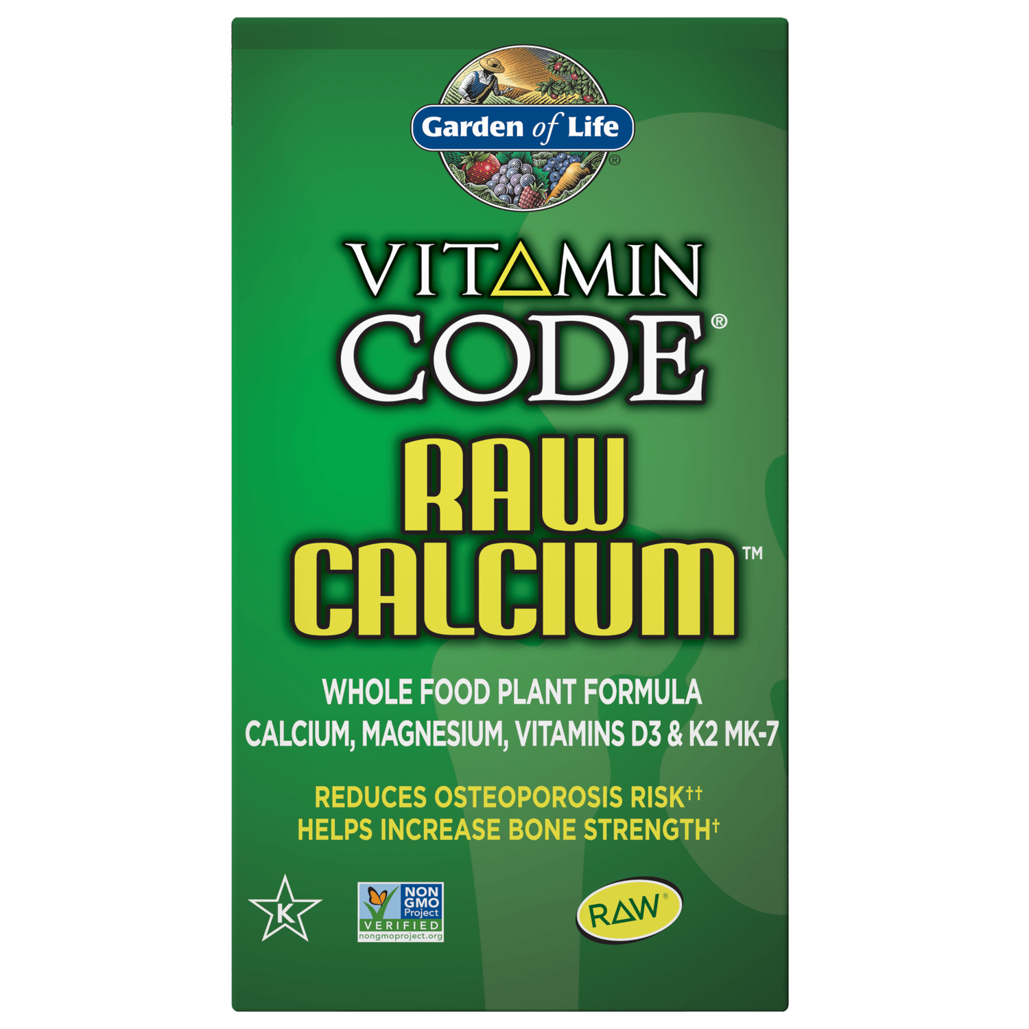Garden of Life Vitamin Code Raw Calcium contains whole food plant calcium, magnesium, 1,600IU of vitamin D3 and 100mcg of K2 (MK-7.) The raw, uncooked base blends 24 fruits and vegetables and natural food cofactors with naturally occurring trace minerals.