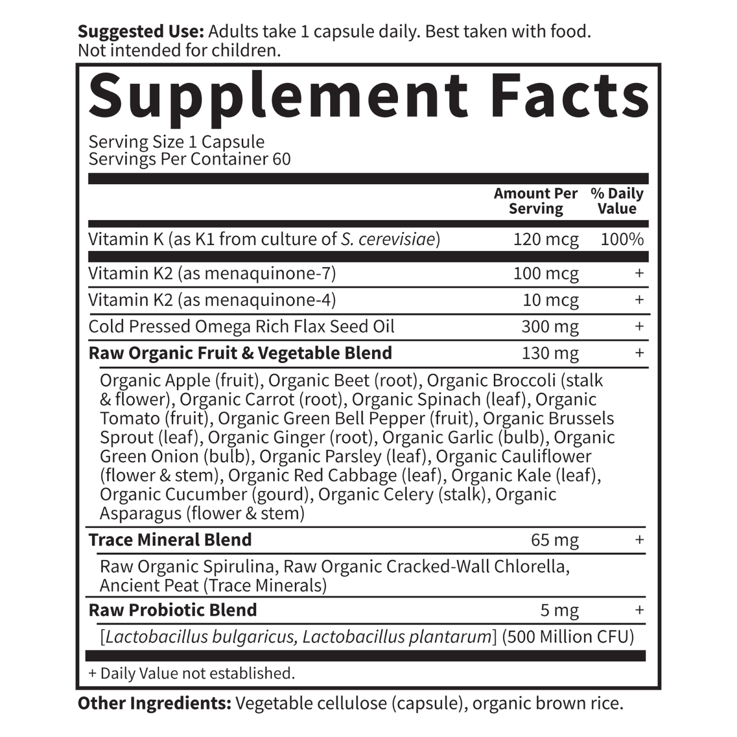 Our Vitamin Code RAW K-Complex comprises whole food nutrition, made from a base of vitamin K-rich, cold-pressed, omega-rich chia and flaxseed oil, designed to help with the absorption of essential nutrients from food. Overall, the formula features extracts of 23 organic fruits and vegetables.