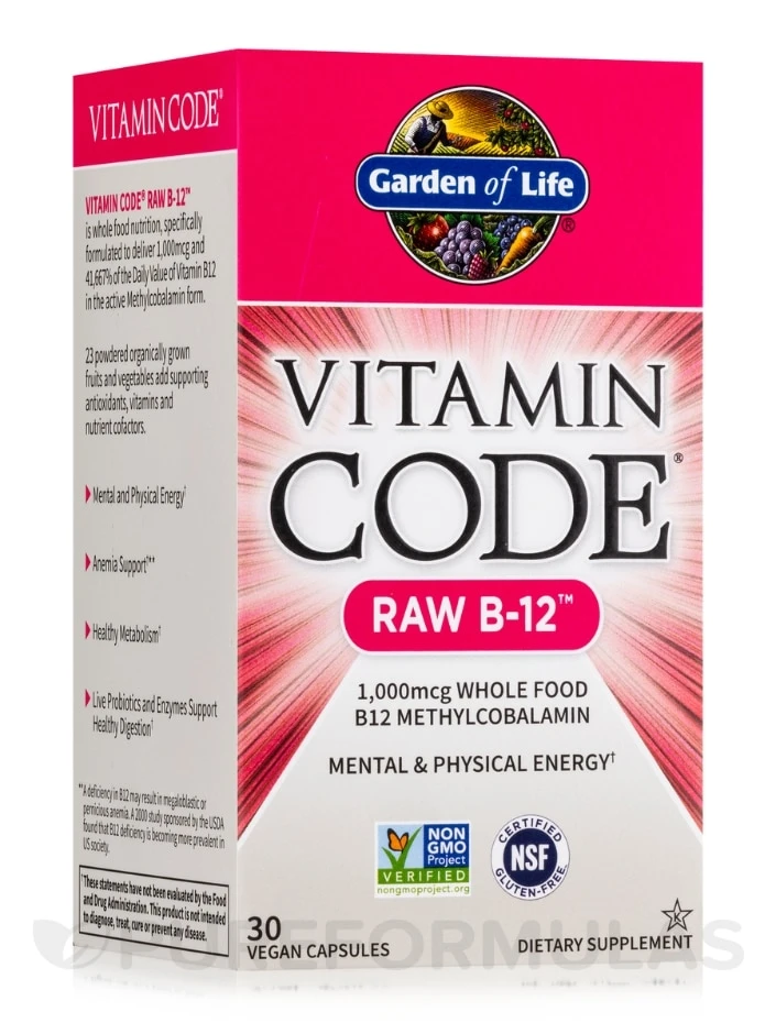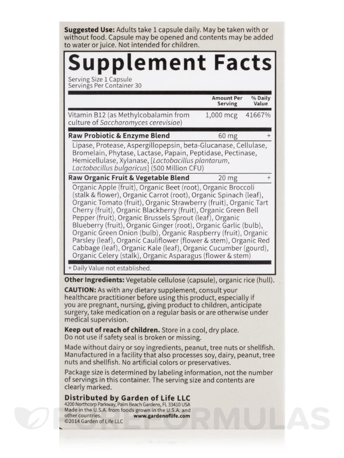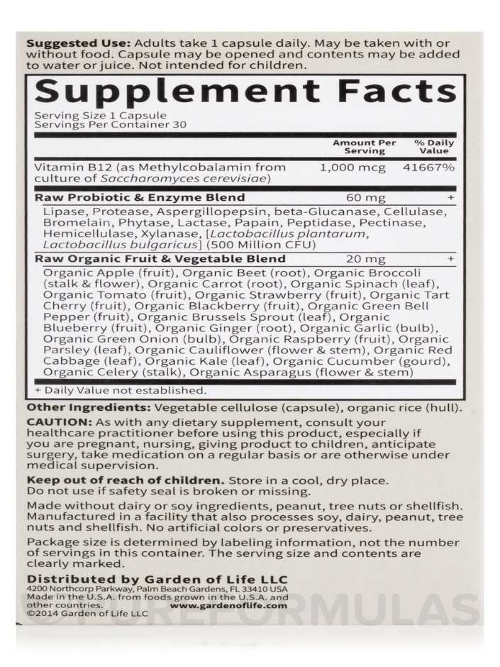 Discover the power of whole-food vitamin B12 with Garden of Life®’s RAW B-12. This comprehensive formula is created with RAW Food-Created Nutrients™, which retain their unique Code Factors™ found in natural foods to provide optimal nutrient delivery. Say goodbye to fillers and binders – this RAW B-12 is gluten-free and dairy-free. But we don’t stop there. We’ve infused this formula with probiotics and enzymes, alongside an organic fruit and vegetable blend for extra nourishment. Elevate your wellness with Vitamin Code RAW B-12.